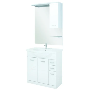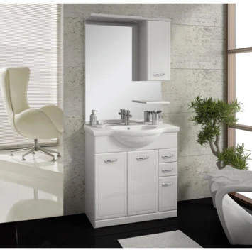 Wil je een badmeubelset met veel opbergmogelijkheden? Ga dan voor Atlantic badmeubelset Beatrice wit. Deze set bestaat in het totaal uit een spiegel, wastafel, 4 kastjes, 2 lades en een plank en biedt daarom genoeg ruimte voor je handdoeken, föhn en andere badproducten. Bovendien is de set voorzien van geïntegreerde lichtspots, zodat je er geen passende lamp bij hoeft te zoeken. De onderkast is 80cm breed en de wastafel is met 85,5cm net iets breder. Dankzij de witte hoogglans die over de spaanplaat heen zit, krijgt deze set een extra moderne uitstraling. Kortom: met deze badmeubelset is je badkamer in één keer af.